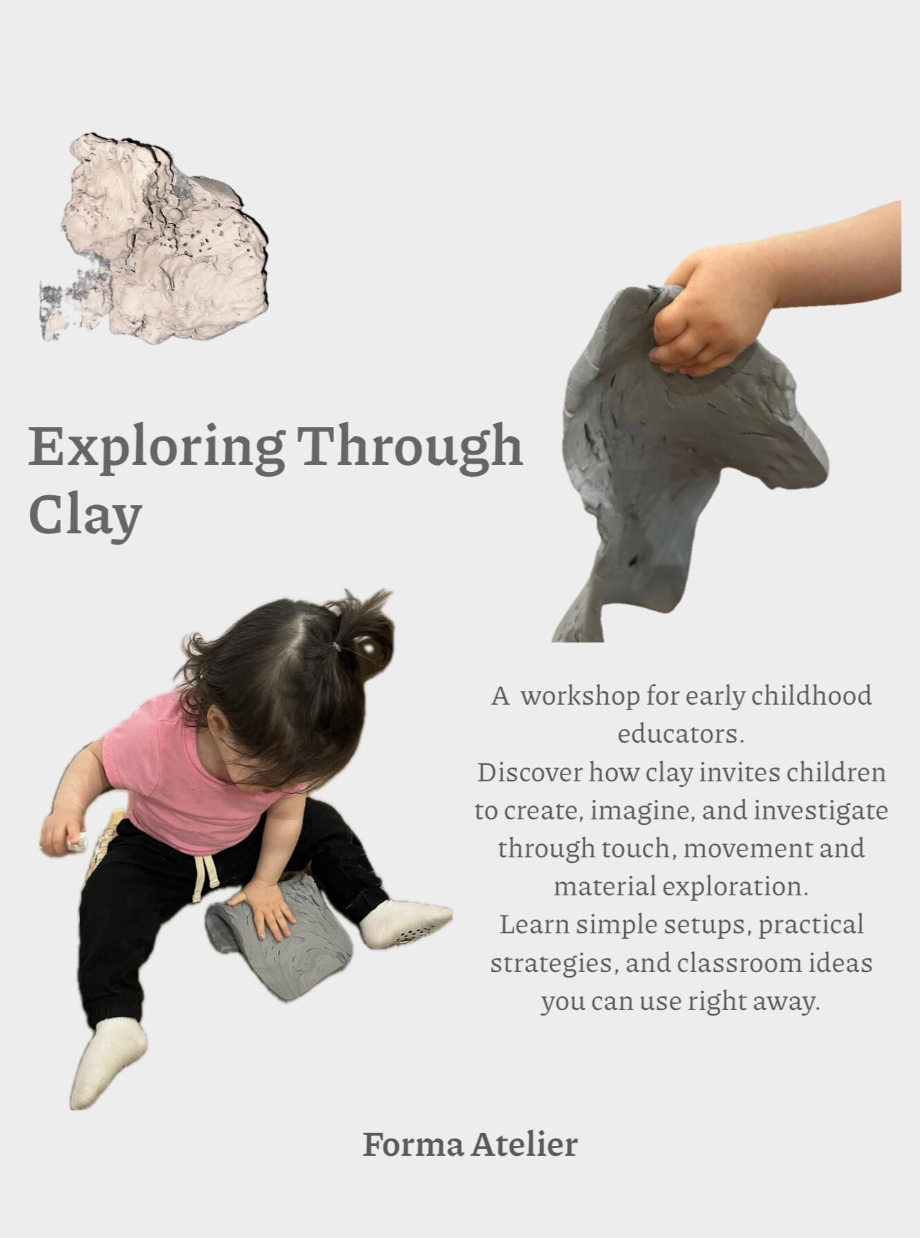 In this workshop, we explore clay as a dynamic material that invites children to create, express, and investigate. Educators will learn about the properties of clay, how to prepare and care for the material, and how to design engaging setups for infants through preschoolers.