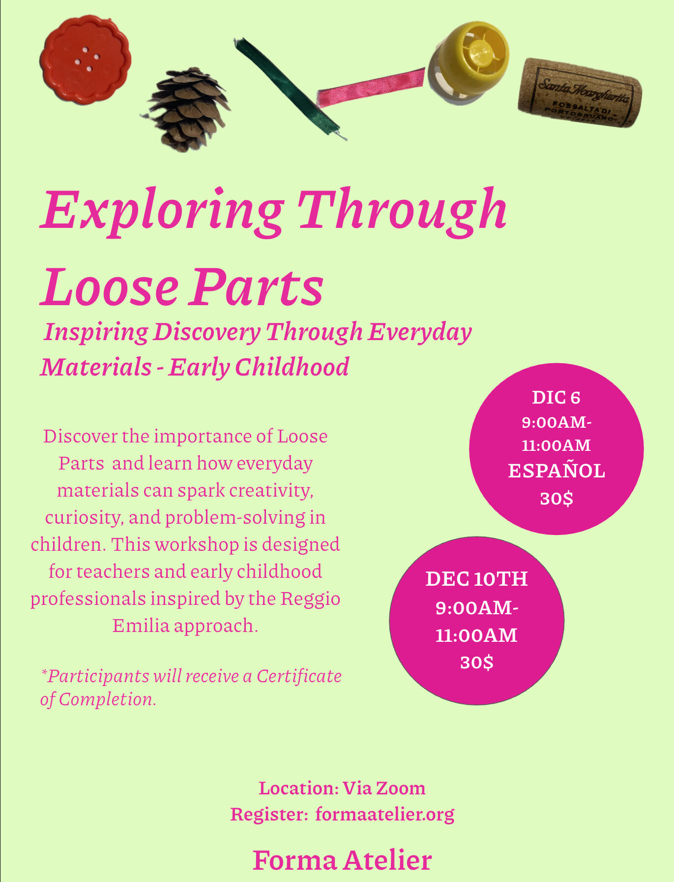 Loose Parts WorkshopDiscover the magic of Loose Parts play and learn how everyday materials can spark creativity, curiosity, and problem-solving in children. This workshop is designed for teachers and early childhood professionals inspired by the Reggio Emilia approach.